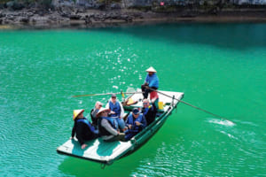 We will spend 1-hour round trip paddling through a little grotto and into our private lagoon, surrounded by rock walls in all directions. It’s a peaceful little corner of Halong Bay all to ourselves. The tour guide will tell the folklore of Halong Bay before paddling back to the boat.